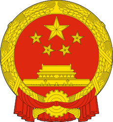 The National Emblem of the PRC features Tiananmen Gate beneath the five shining stars, encircled by ears of grain and with a cogwheel at the bottom. The ears of grain, stars, Tiananmen and cogwheel are gold; the field within the circle is red, as are the ribbons festooning the bottom of the circle. These two colors traditionally represent auspiciousness and happiness.